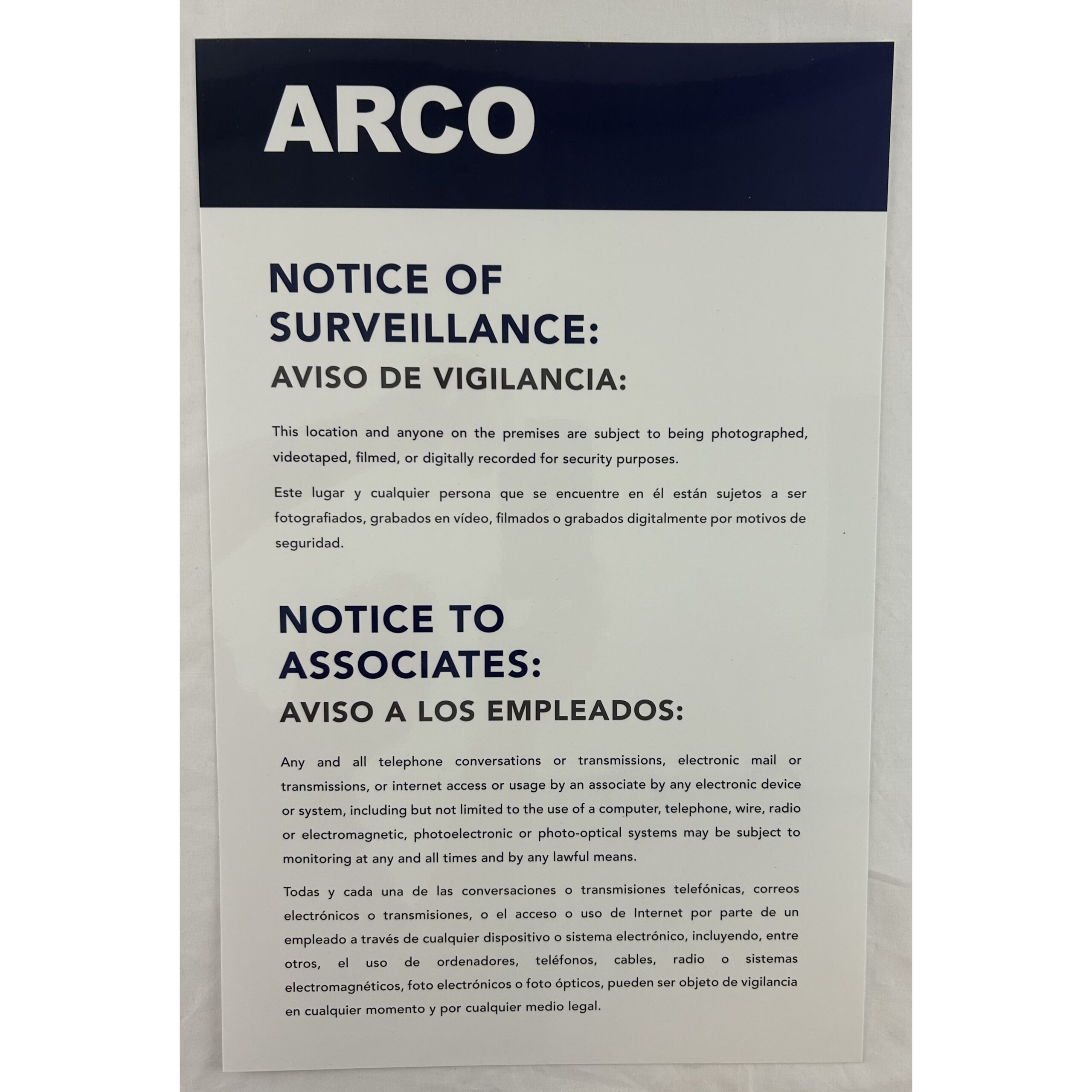 Single Poster – LEGAL MONITORING NOTICE POSTER REQUIRED in AZ, CA, TX & NY – Offered as a single poster that includes English and Spanish
